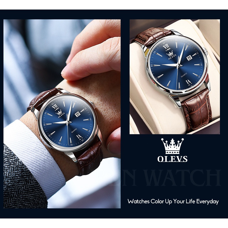 OLEVS Jam Tangan Pria Kulit Anti Air Original Cowok Kalender Luminous Analog Arloji Bisnis Fashion Men Watch Ready Sto