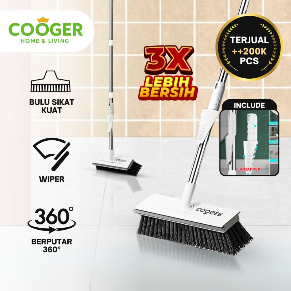 COOGER Homeliving Sikat 3in1+Wiper Lantai Pembersih Kamar Mandi Penyeka Air Lantai Gagang Panjang Bulu Tebal Anti Rontok