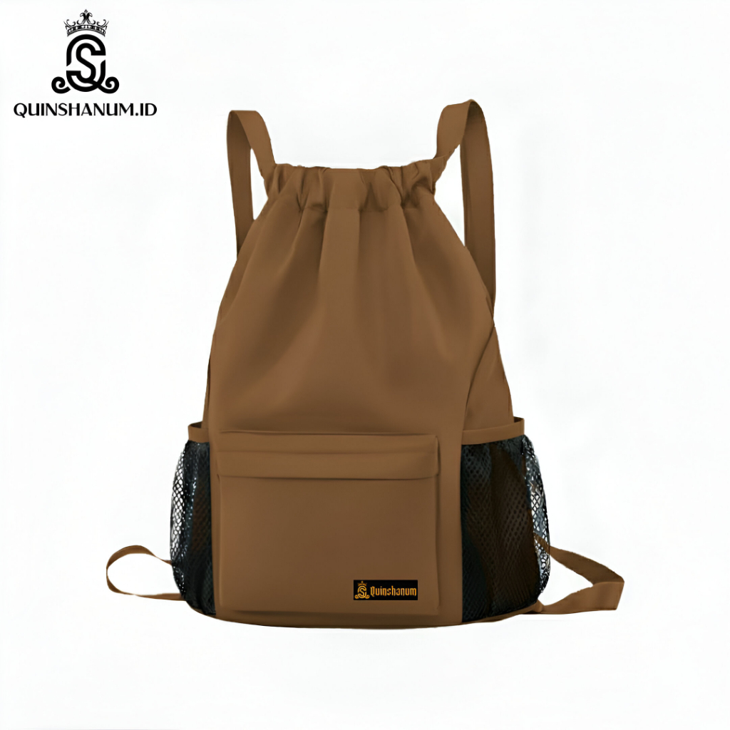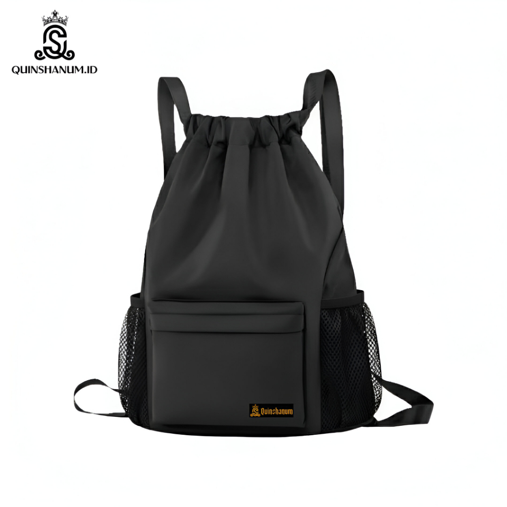 Quinshanum.ID - Tas Serut Multifungsi dengan Saku Depan & Saku Jaring Botol – Tas Santai / Gym / Sekolah