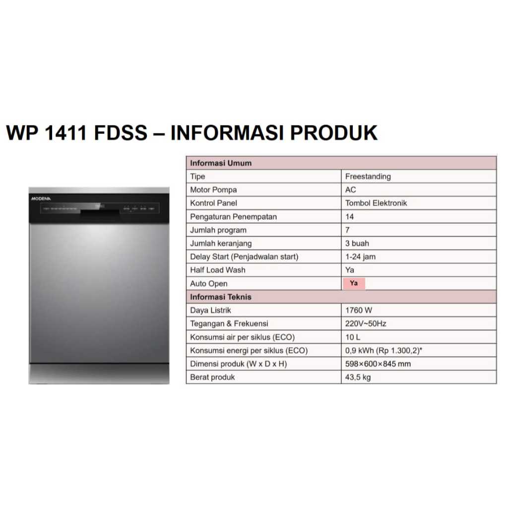 MODENA WP 1411 FDSS Dishwasher Freestanding atau Mesin Pencuci Piring