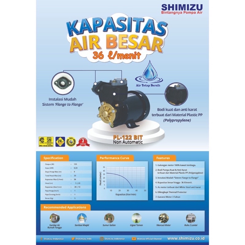 Pompa Air Shimizu PL 122 Bit 125W 36L/Menit