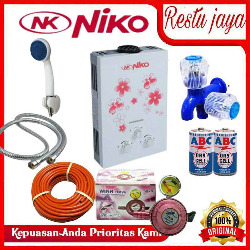 Water heater Pemanas Air Kamar Kamar Mandi Gas Niko Satu Set Lengkap Warna Putih