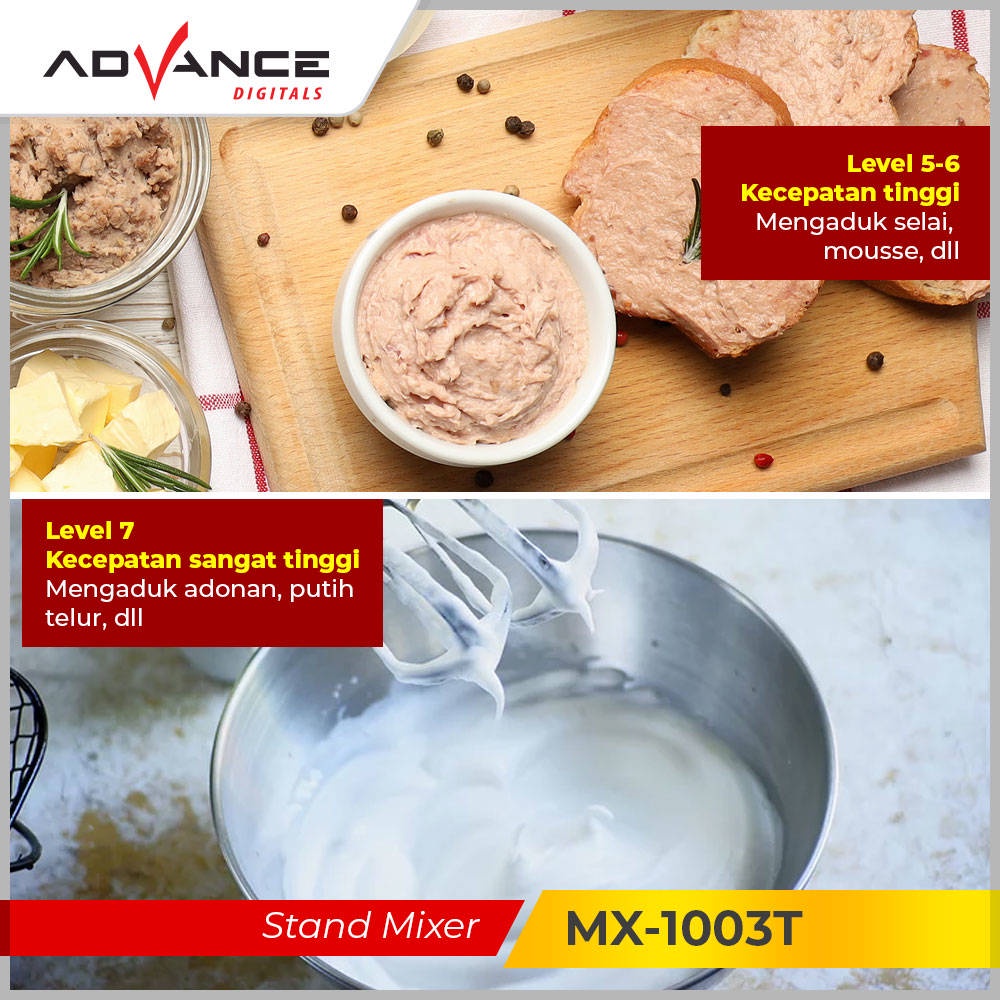 Stand Mixer Advance Mx-1003T Mangkuk Stainles + 2L Pengocok Telur Mesin Roti 7 Kecepatan Pengaduk