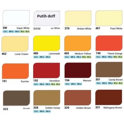 SW White/Putih, SWM White Dof Matt, SB Black/Hitam, SBM Black Dof Matt, 189 Grape, 190 Flame Orange, 191 Sunrise, 192 Vermilion(merah), 194 Maroon, 197 Orchid Violet