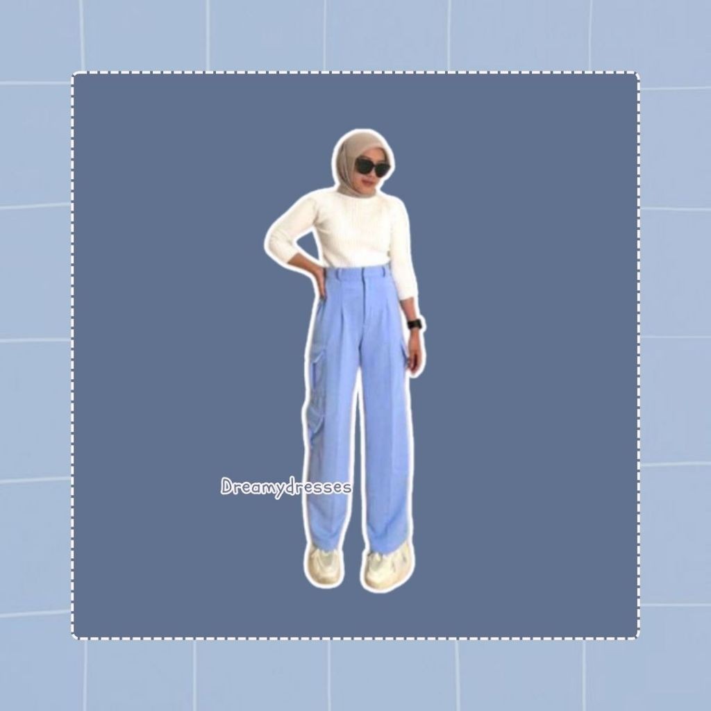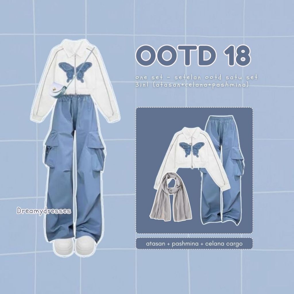 dreamyootd 3in1 Set 18 - One Set Korean Style Hoodie Pashmina Ceruty Celana Cargo Felix Biru Setelan Wanita fit Kekinian Jennie