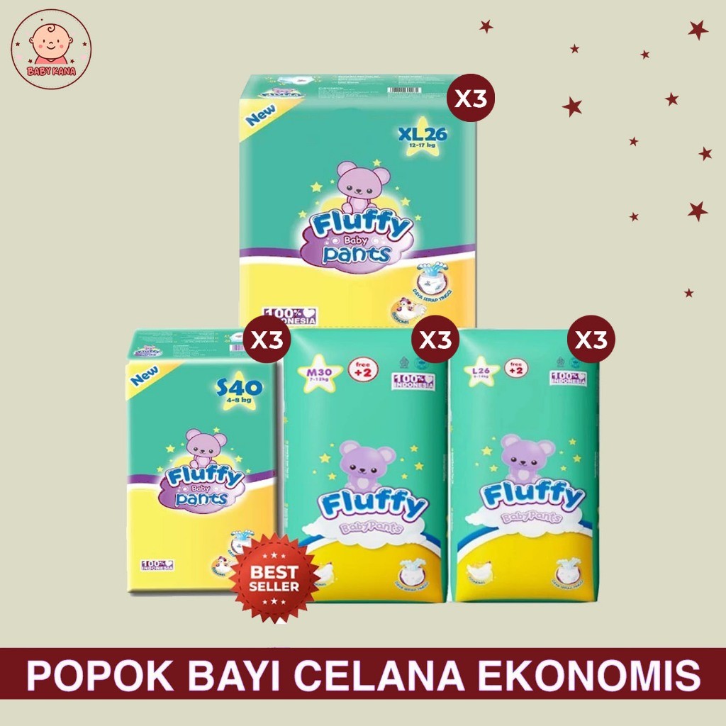 [PAKET 3 Ball] FLUFFY Popok Bayi Tipe Celana Anti Bakteri Size S40 M30 L26 XL26 Pcs