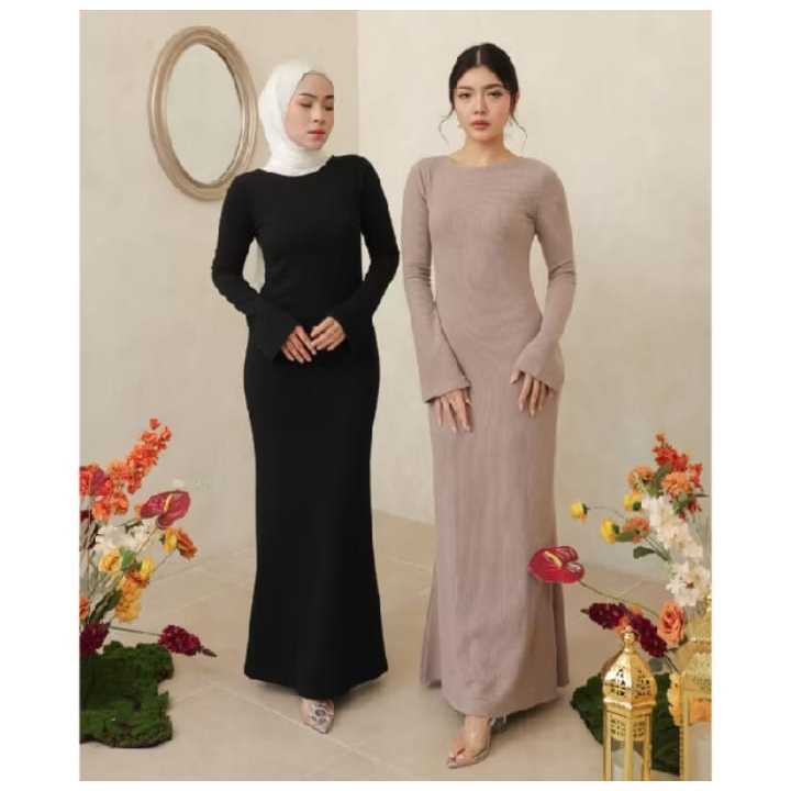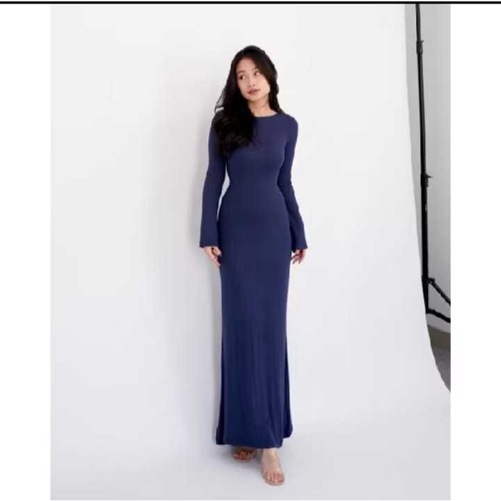 Long Dress - Slim Fit Gaun Wanita Rib Knit Casual Basic Dress rajut Press Body Korean style Bodycon