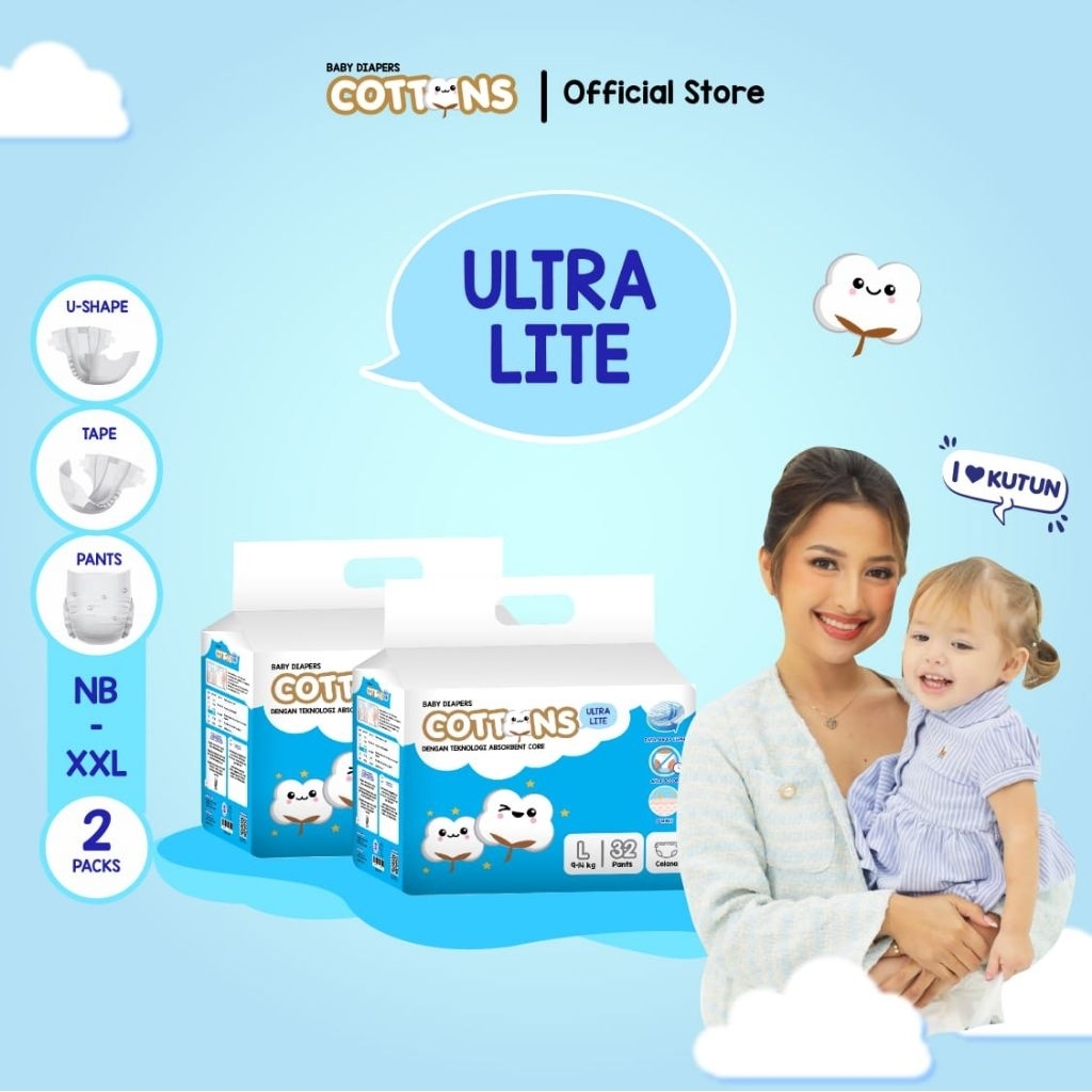 TWINPACK Cottons Baby Diapers Ultra Lite NB/S (Tape/Perekat) M/L/XL/XXL (Pants/Celana) - Popok Bayi