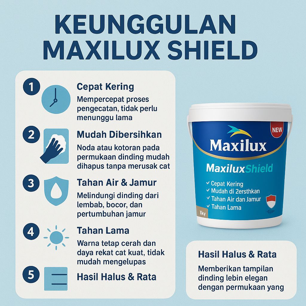 CAT TEMBOK MAXILUX SHIELD 2KG CAT DINDING INTERIOR DAN EKSTERIOR CAT TEMBOK ANTI JAMUR & TAHAN LAMA HASIL HALUS ELEGAN