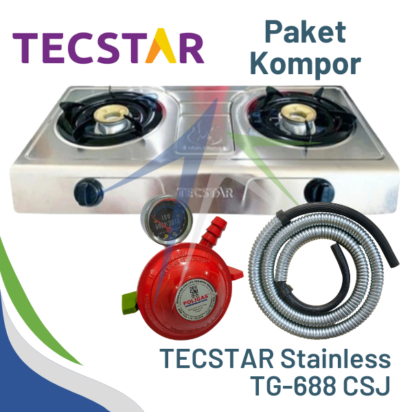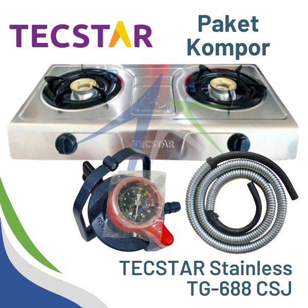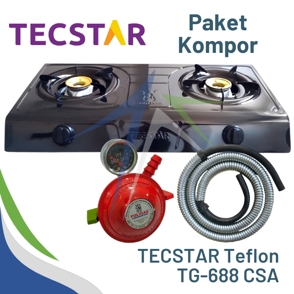 Kompor Gas 2 Tungku Teflon Stainless TECSTAR PAKET + Selang Gas dan Regulator WINN SIAP PAKAI