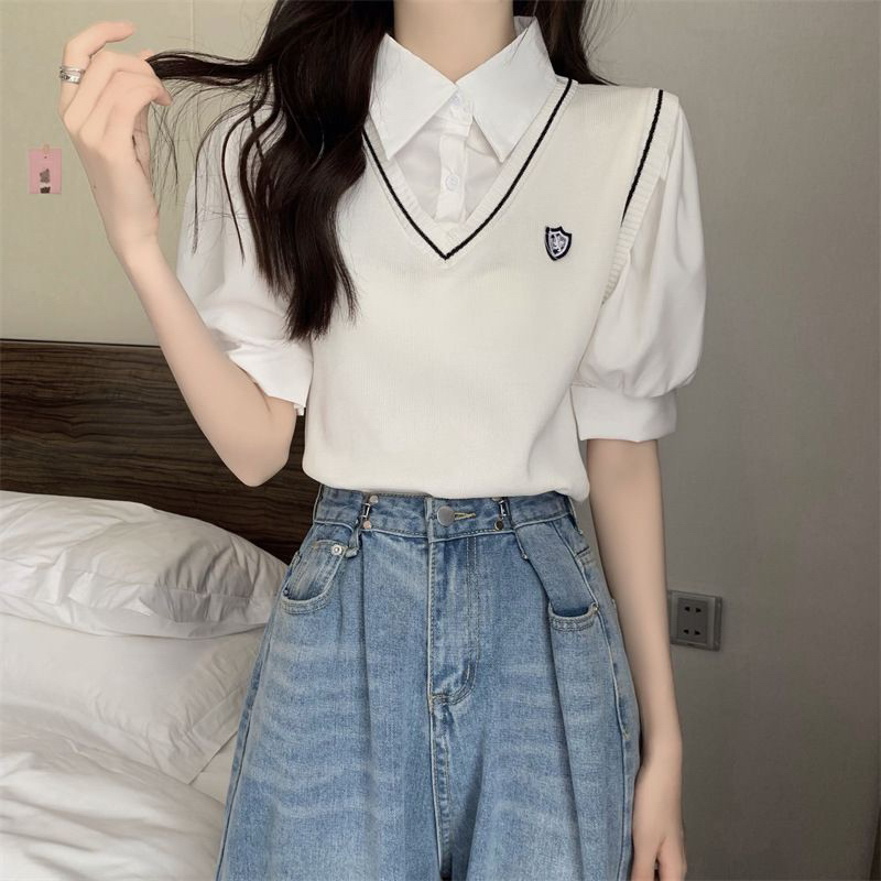 Blouse Atasan Areum Top Blouse Set Vest Shirt (Polo rompi) Collar Kemeja Kerah Knit Rajut Korean Style Lengan Pendek Shirt Academy Uniform Jepang