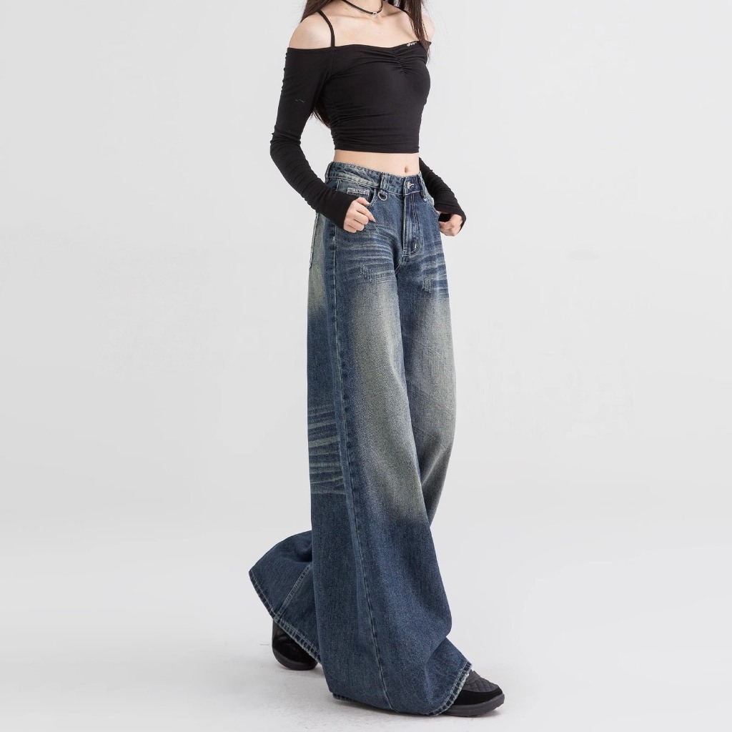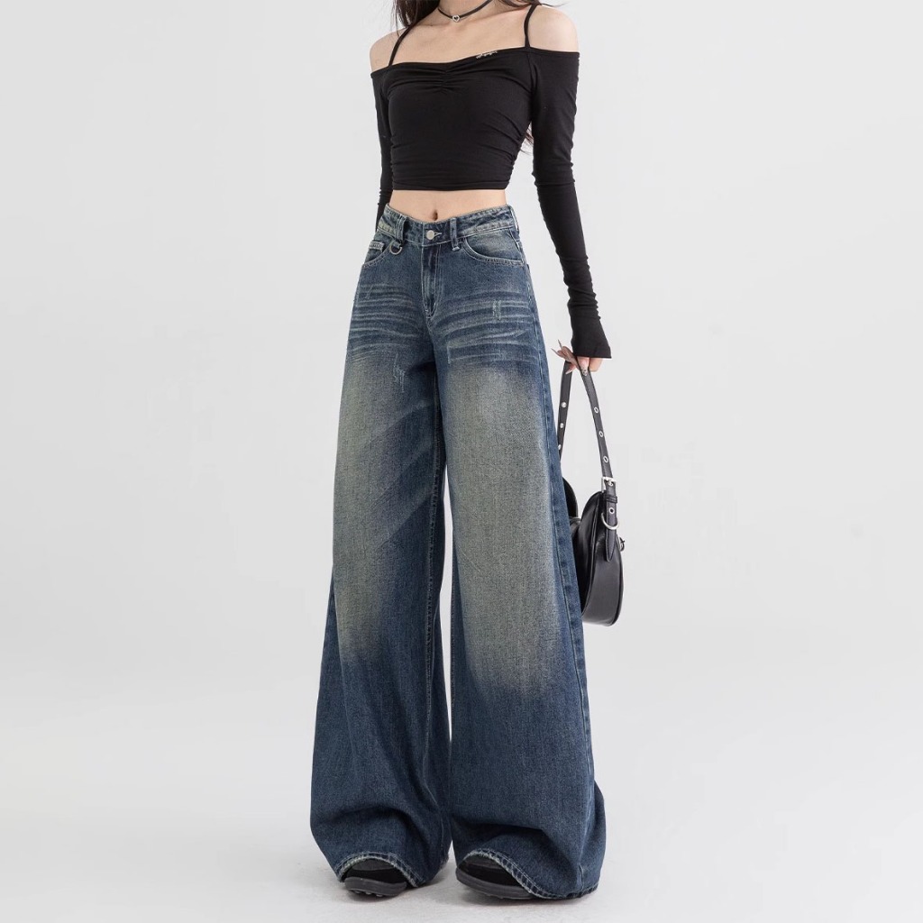 Biru Retro Highwaist Loose Celana Jeans Wanita Korea Style Lurus Celana Jeans Wanita Highwaist Denim Kekinian