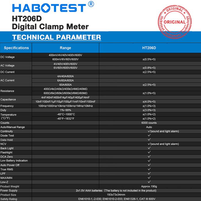 [SPECIAL PRICE] HABOTEST HT206D Tang Ampere Meteran Klem 600V AC/DC 6000 Multimeter Digital 600A Ohm Kontinuitas Hz
