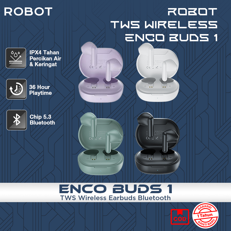 ROBOT TWS Bluetooth 5.4 Semi In-Ear Headset Wireless Earbuds 36 Jam Baterai IPX4 Original ENCO BUDS 1