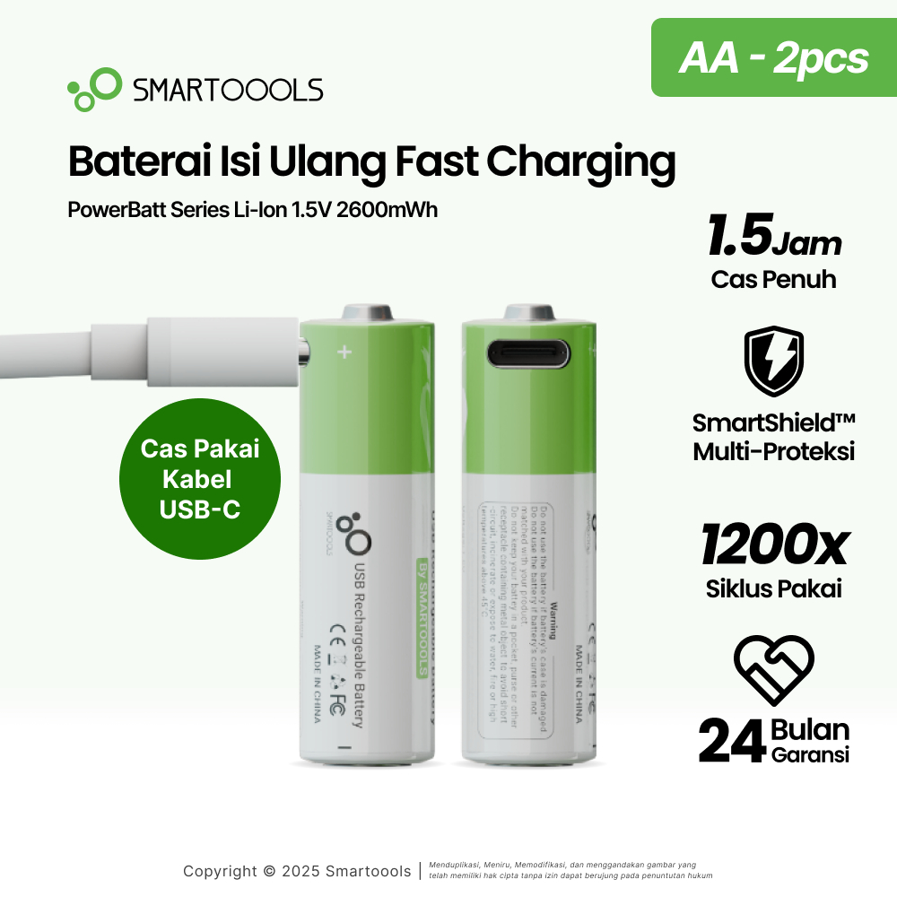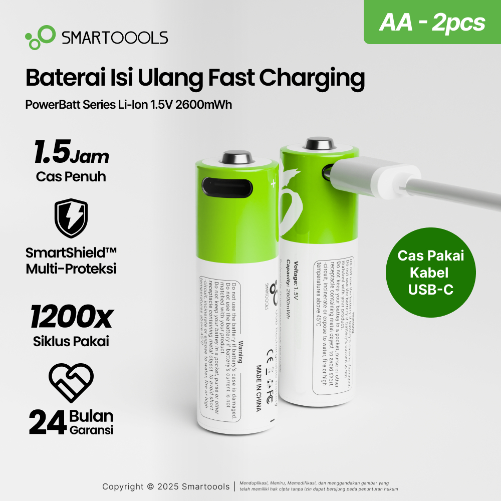 Baterai Cas Isi Ulang 2pcs Smartoools AA 1.5V Type-C USB Rechargeable Lithium Battery Charge