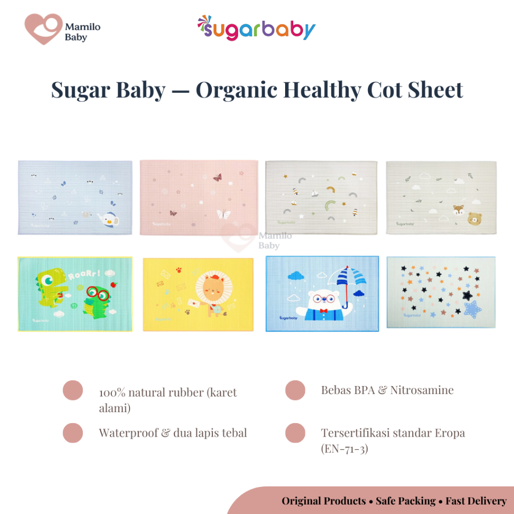 Sugar Baby Organic Healthy Cot Sheet 90×60 cm / Perlak Karet Organik Waterproof / Perlak Bayi (BANYAK MOTIF)