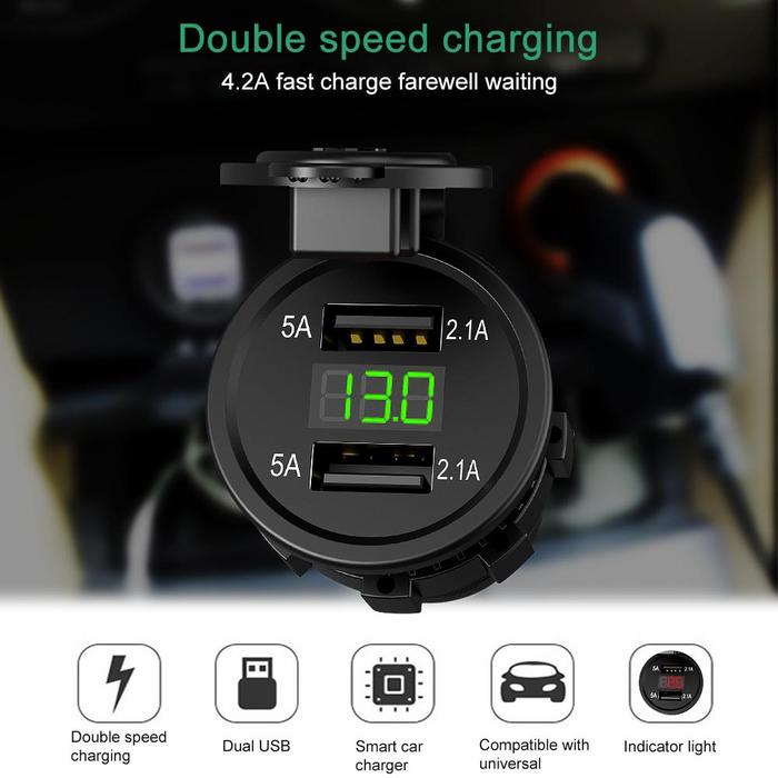 Charger Hp Di Motor 2 Port Usb+Led Voltmeter Universal - Dengan Led