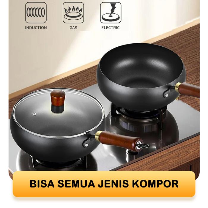 EXCLUSIVE YENNY DI CHINA TEXANIA PANCI BESI NON-COATING ANTI LENGKET GAGANG KAYU TUTUP KACA DIAMETER 24CM KITCHENWARE - HITAM