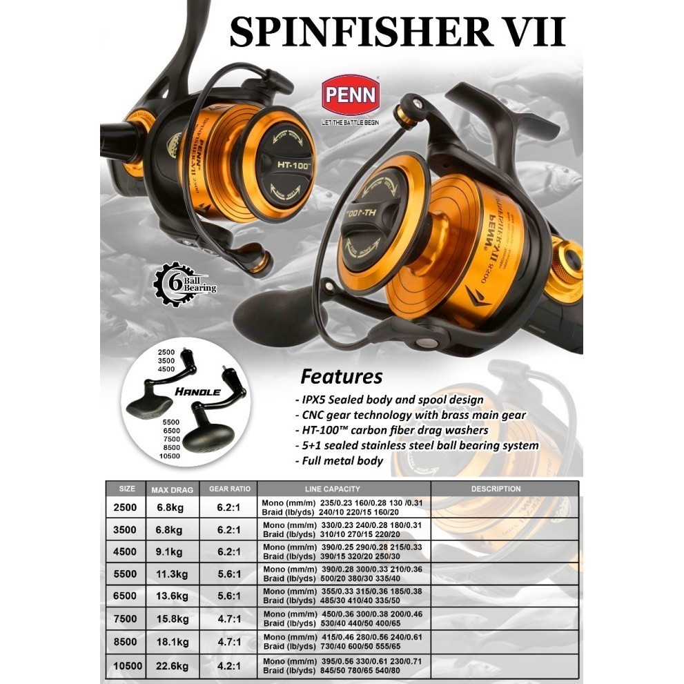 Reel Pancing Penn Spinfisher VII 2500 - 10500 5+1BB Full Metal Body IPX5 Sealed CNC gear technology Carbon Drag - 2500