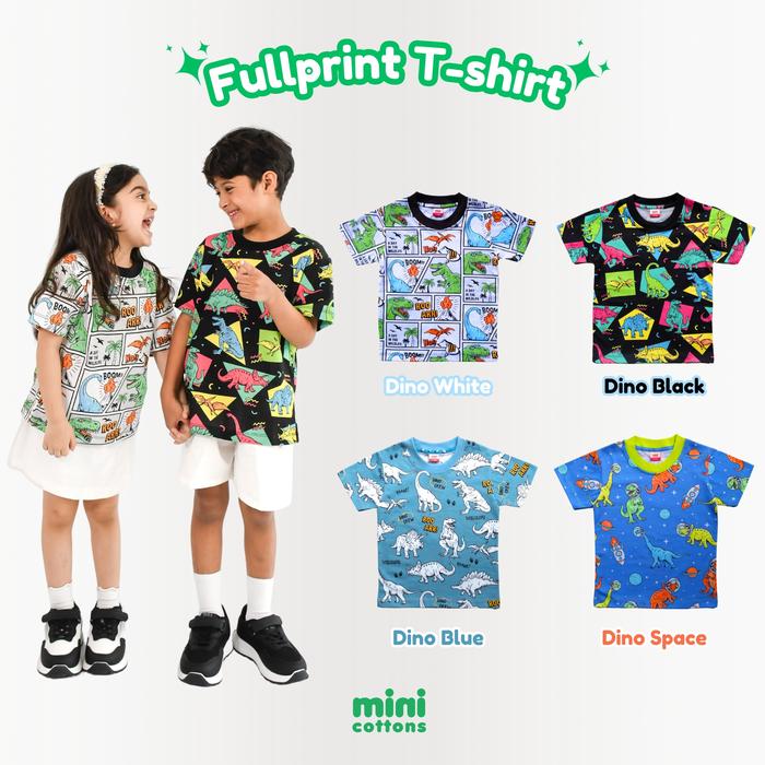 Mini Cottons Kaos Anak Unisex Fullprint Kids Tshirt 100 PERSEN Katun - Dino White, 1-2 Tahun
