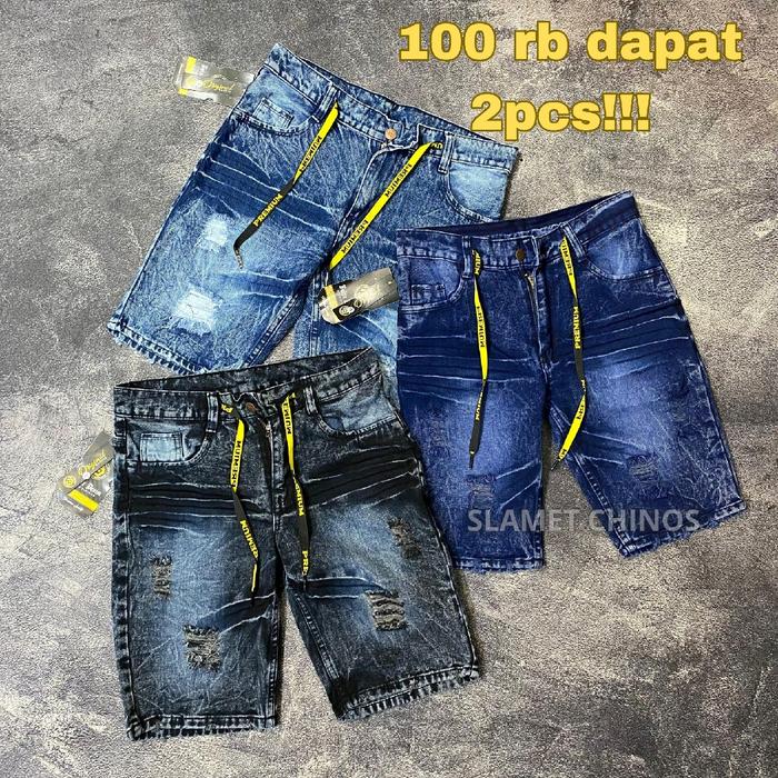 Paket 100Rb Dapat 2Pcs Celana Pendek Jeans Sobek Pria Distro Tagling Premium Harian Shorts - Snow Hitam + Snow Biru,