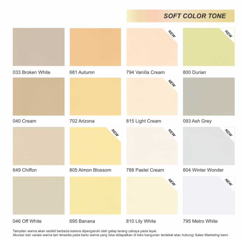Cream (040), Off White (046), Chiffon (649), Smoke Grey (665), White(6000), Mellon Green (713), Banana (695), Palmyra (803), Broken White (033), Super Black (w678)