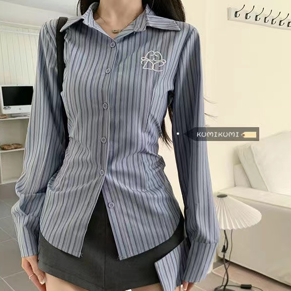 Kemeja Lengan Panjang Bergaris Biru Wanita/Atasan Baju Kemeja Wanita Korean Style