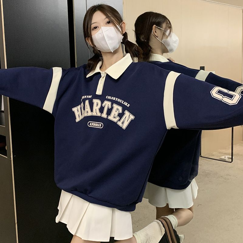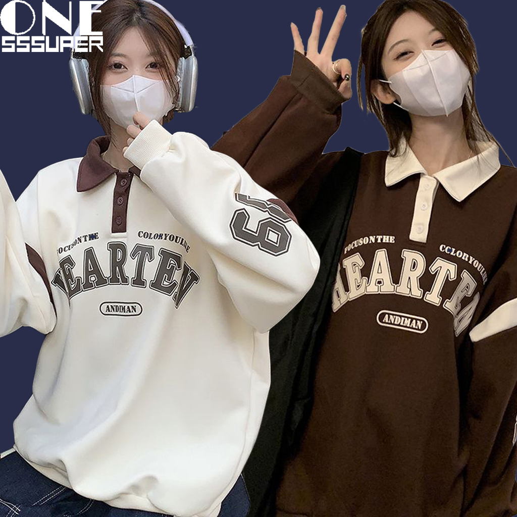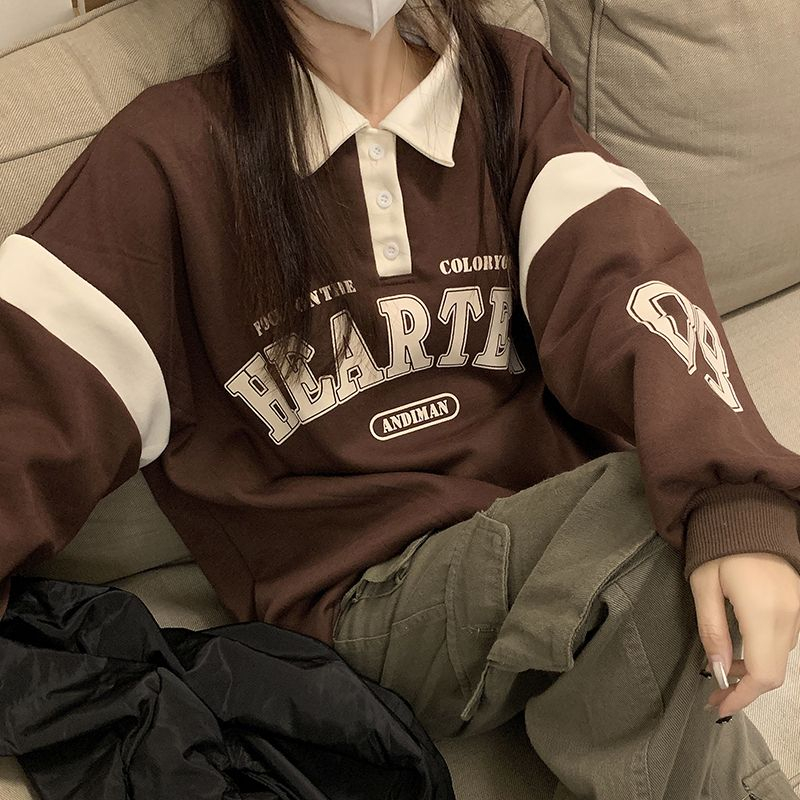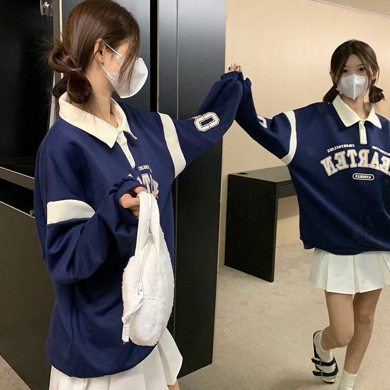M-Xxl Kopi/Aprikot/Biru/Sweater Kerah Polo Warna Kontras Atasan Lengan Panjang Wanita Gaya Korea, Tiga Warna Adalah Opsi
