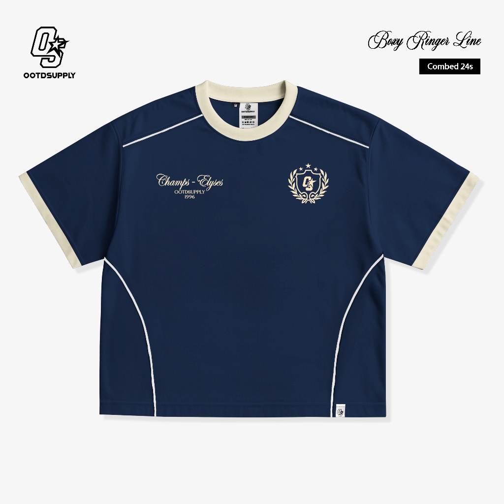 Ootdsupply Oversized Boxy Elyses Navy Ringer Line Cream | Oversize Pria & Wanita | Kaos Unisex | Os-Ovz-Bx-Rl006