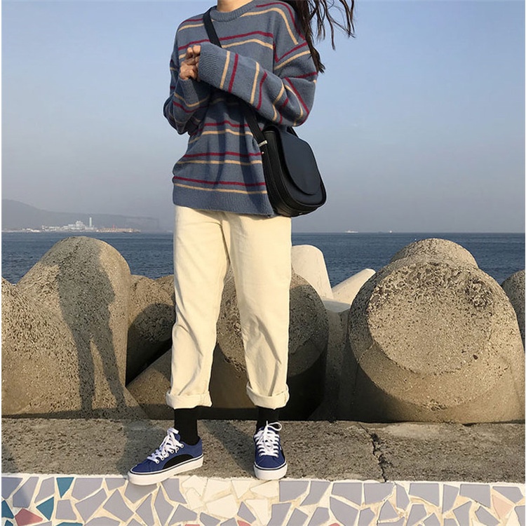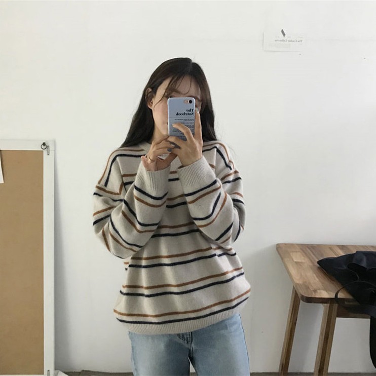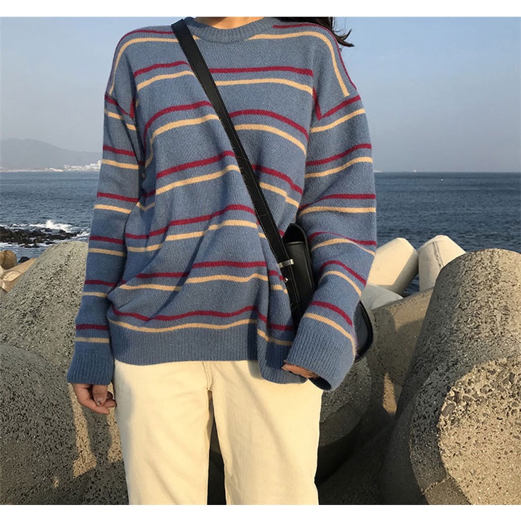 Sweater Model Round Neck Lengan Panjang Motif Garis Untuk Wanita