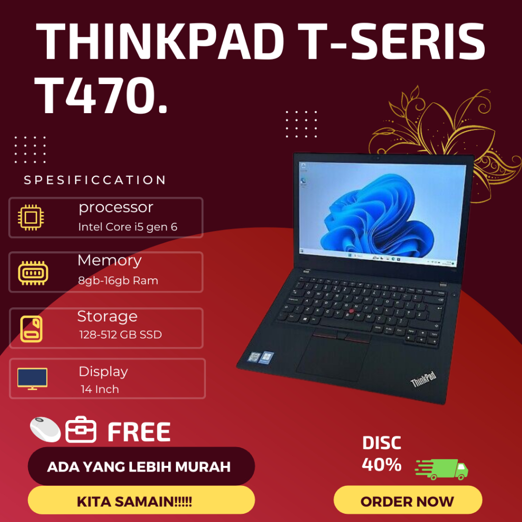 Laptop Lenovo Thinkpad Intel Core i5 T450/T460/T470/T480/T490 Ram 8 Ssd 256 Bergaransi LIKE NEW