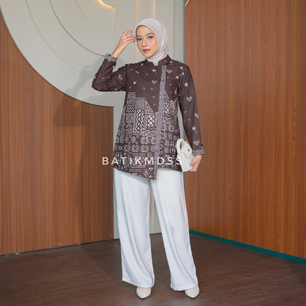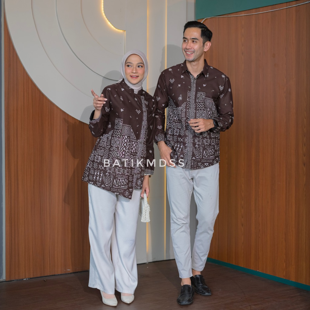 Atasan Batik Couple Pria Wanita Blouse Dan Kemeja Ekslusive Lapis Trikot “Layla Coklat Mahogani”