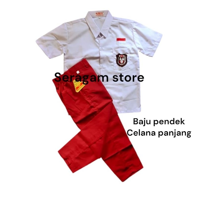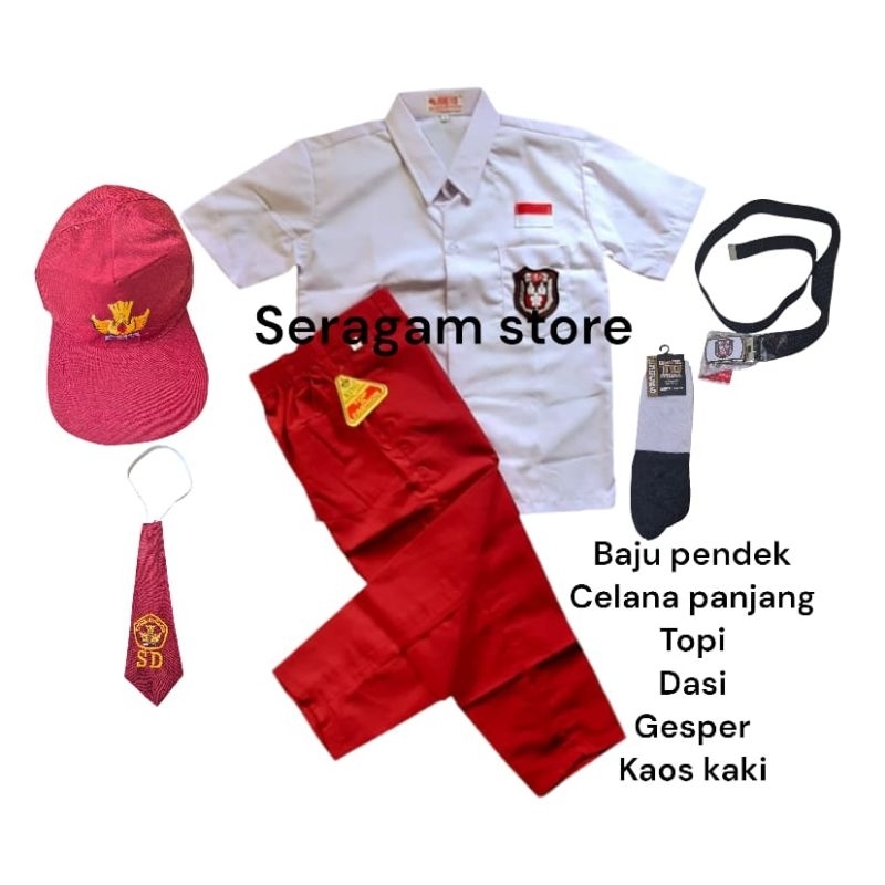 SERAGAM SD SETELAN SET LENGKAP BAJU PENDEK, CELANA PANJANG, TOPI, DASI, GESPER,DAN KAOS KAKI