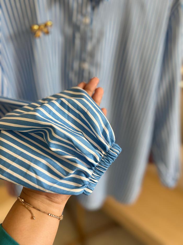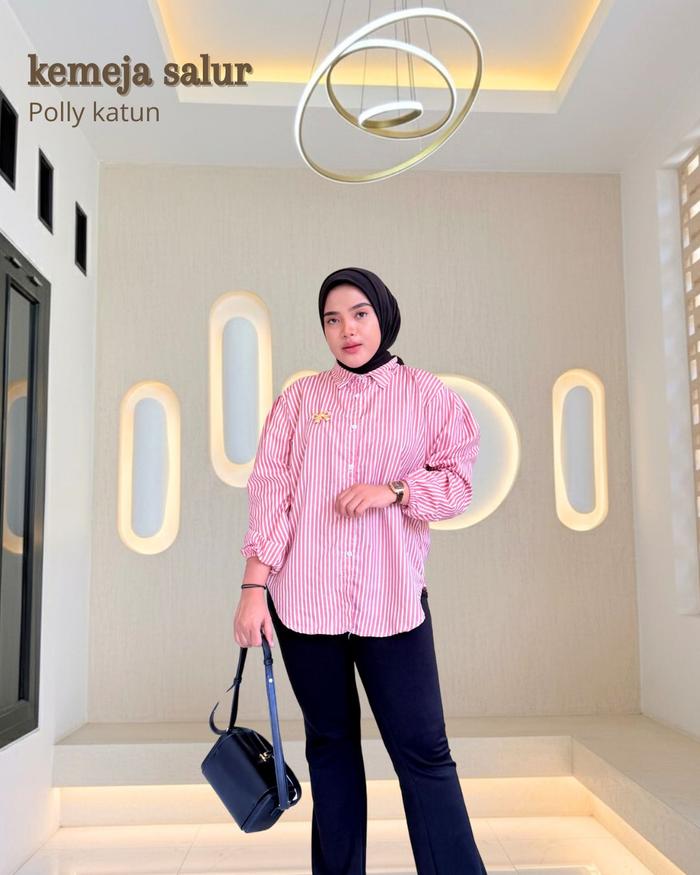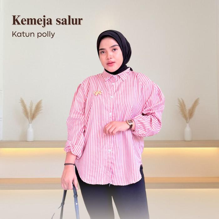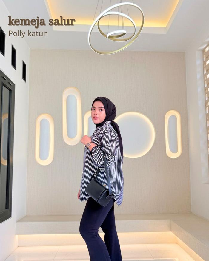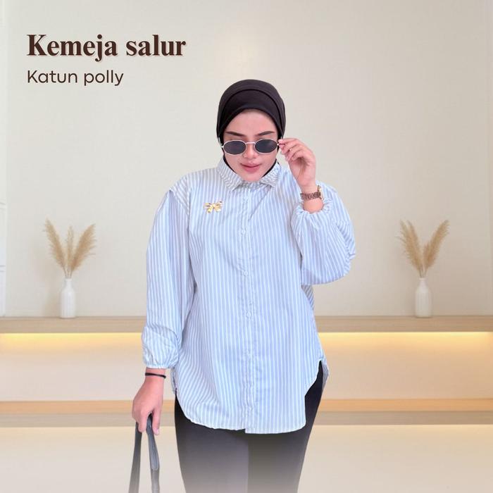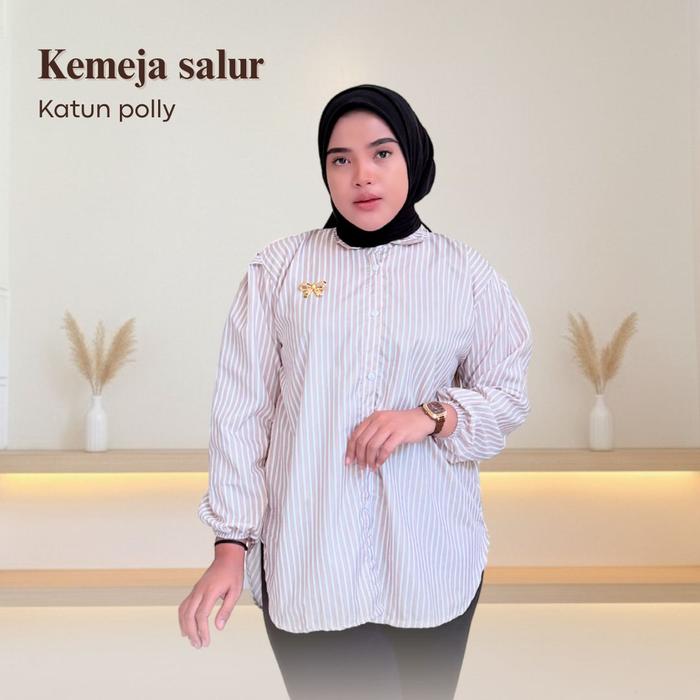 Kemeja Salur Katun Polly Dmfashion Atasan Panjang Baju Wanita Kerah Kancing Karet Oversize - Hitam, L (Ld110)