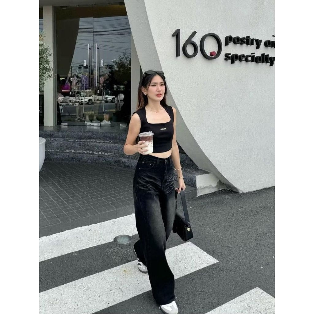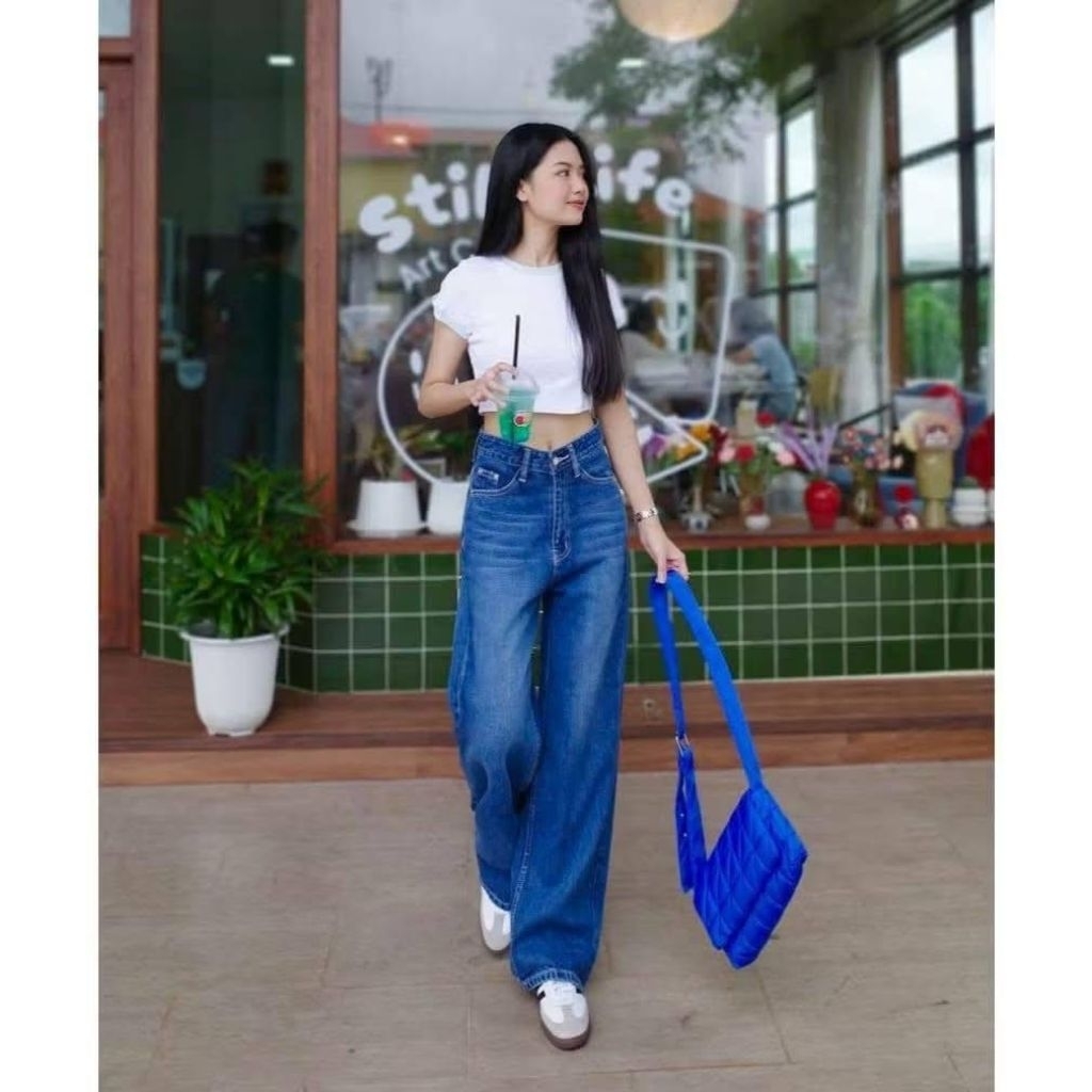 Unisex - Highwaist Baggy Jeans Celana Jeans Baggy Gombrong Whisker Retro Kekinian