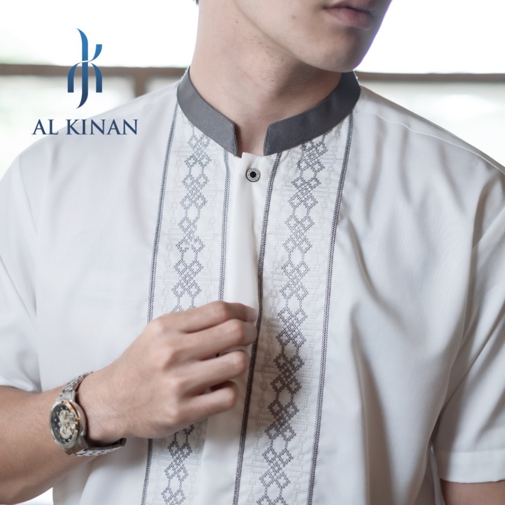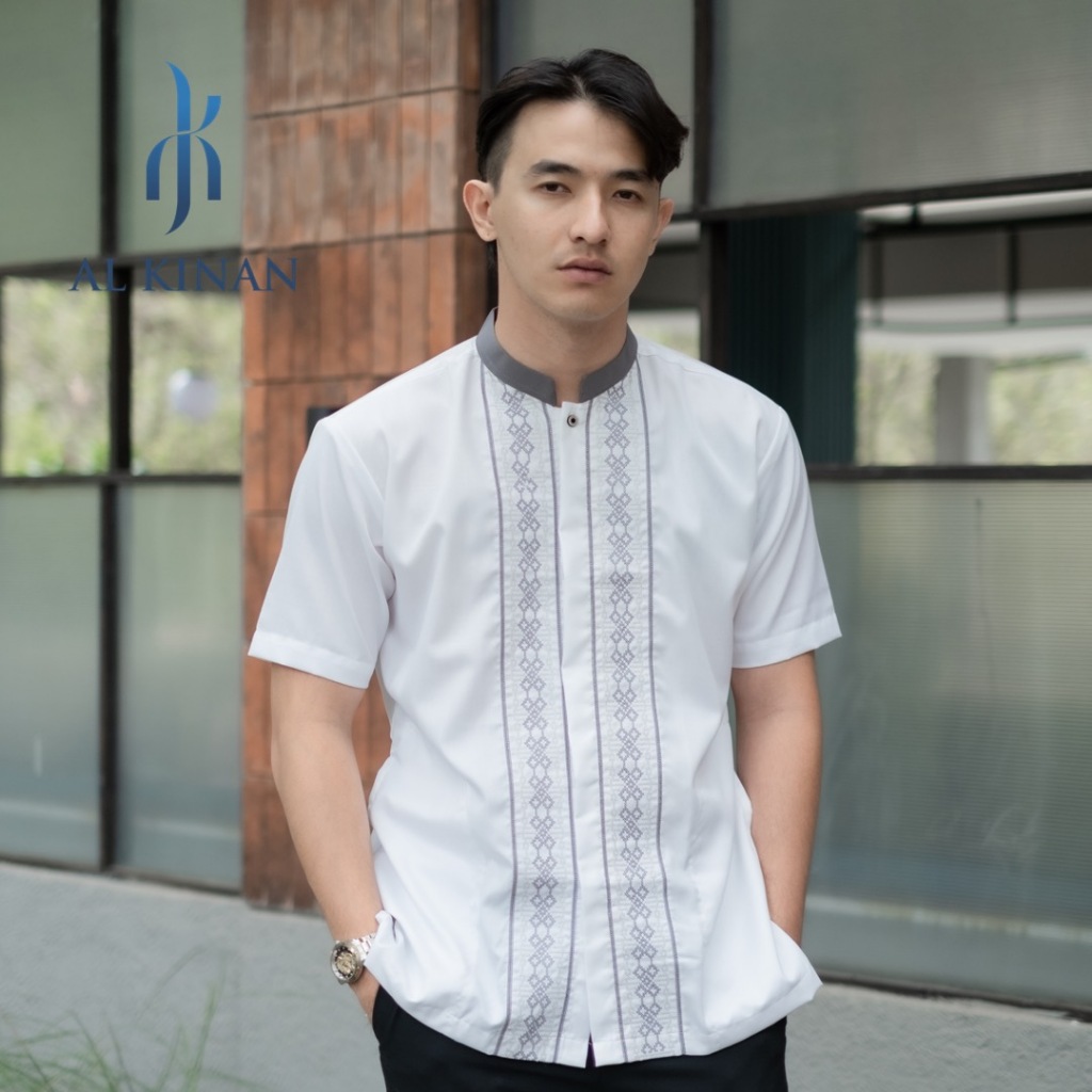 BAJU KOKO DEWASA TANGAN PENDEK ALKINAN MUSLIM BORDIR PUTIH TULANG KATUN TOYOBO