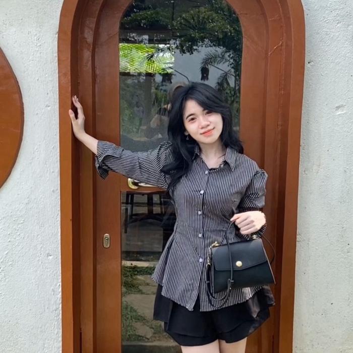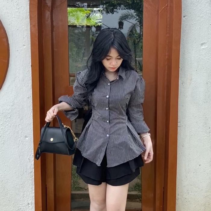 Kemeja Stripe Rampel Fit Body Wanita Atasan - Black, S (Ld 90Cm)