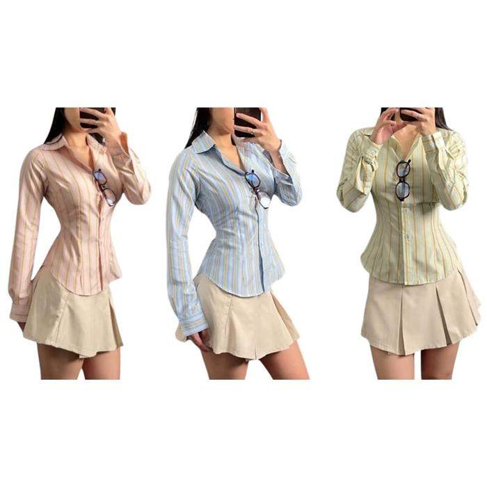 (Paket Hemat 3 Pcs 100Rb) Wispie Girl Boss Fitted Shirt | Kemeja Kerja Wanita Fit Garis Stripe Karet Lembut Pink Hijau B