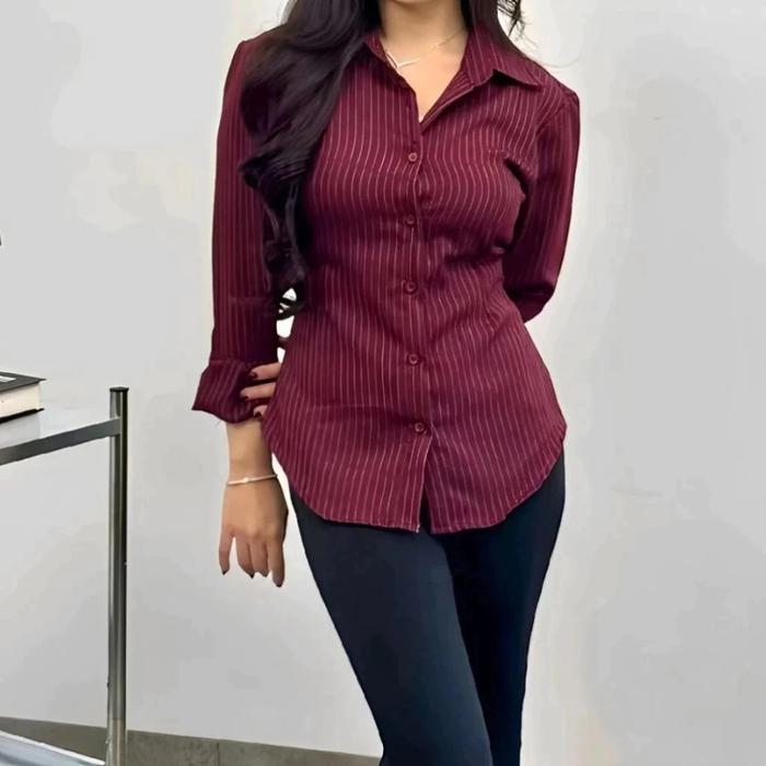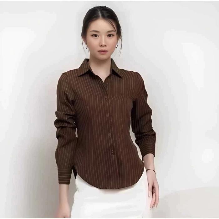 Hanny - Kemeja Luna - Kemeja Wanita - Atasan Wanita Stripe Salur - Kemeja Basic Lengan Panjang - Dark Brown Salur, L