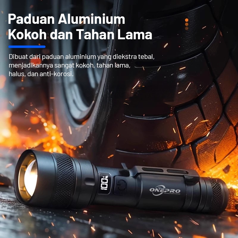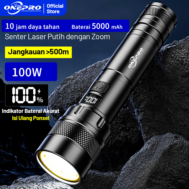 Onepro M49 Flashlight Senter Led Super Terang Zoom Teleskopik 5000Mah 2000Lumen 100W