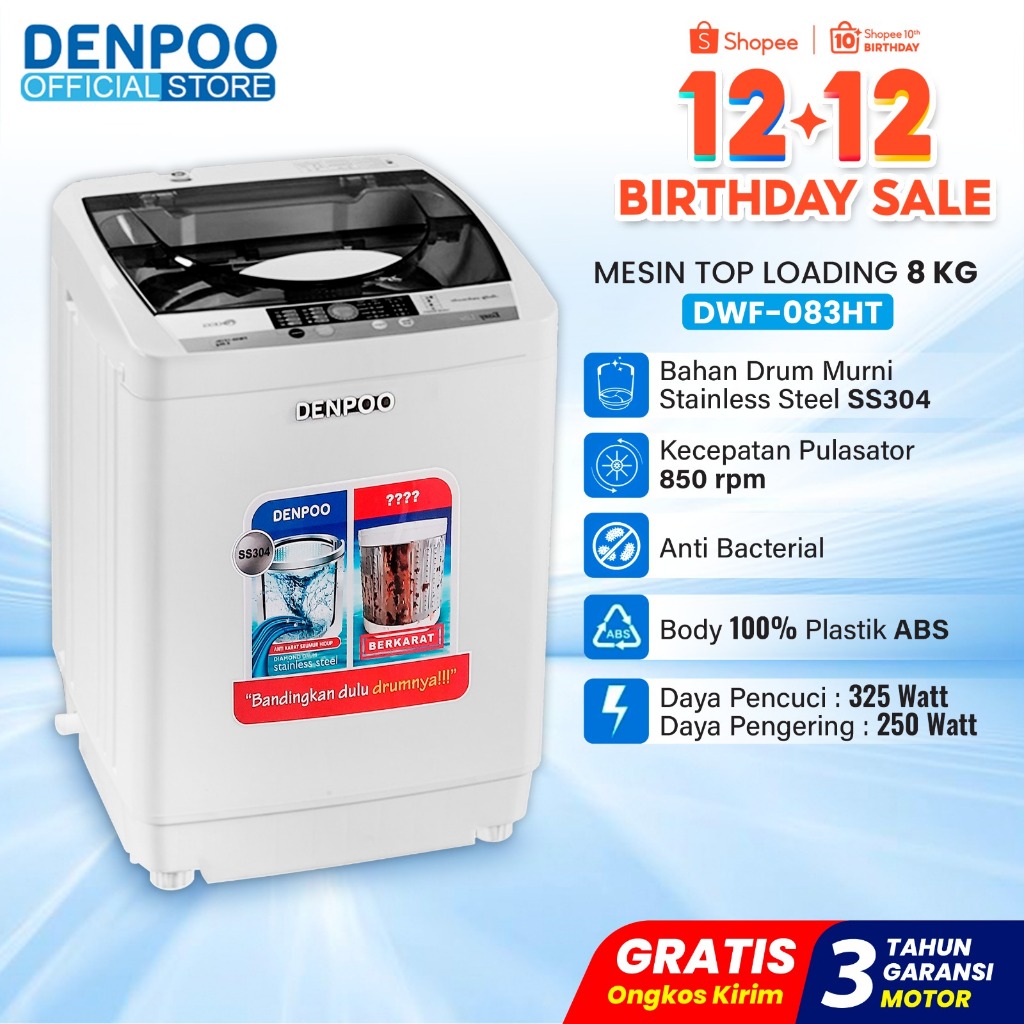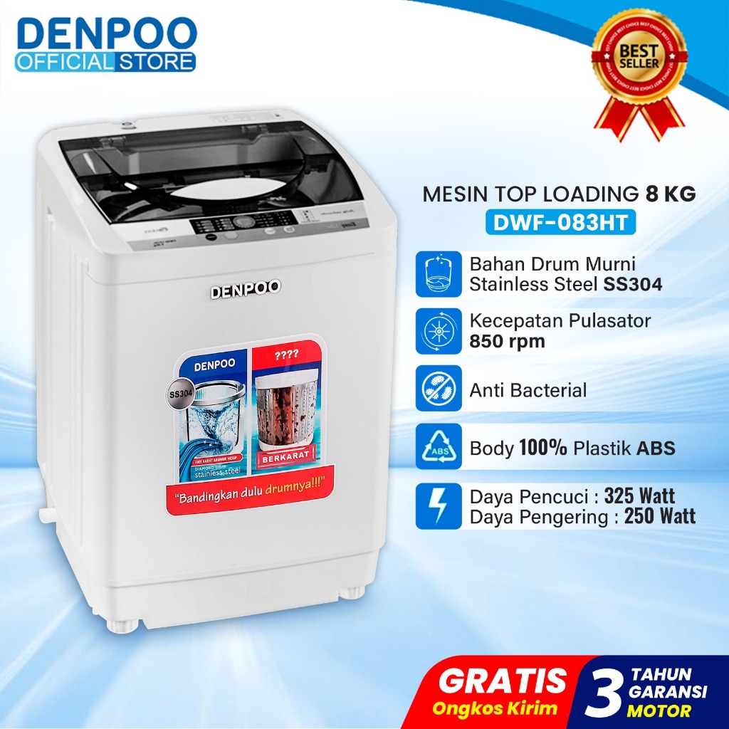 Denpoo Mesin Cuci 1 Tabung Top Loading DWF 083 HT Full Automatis
