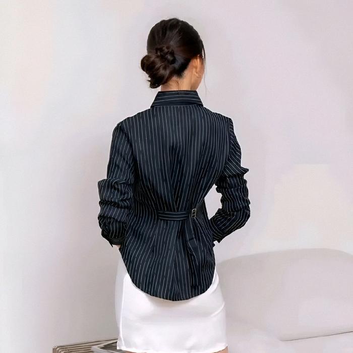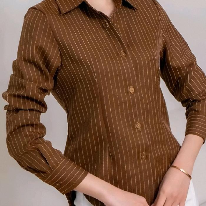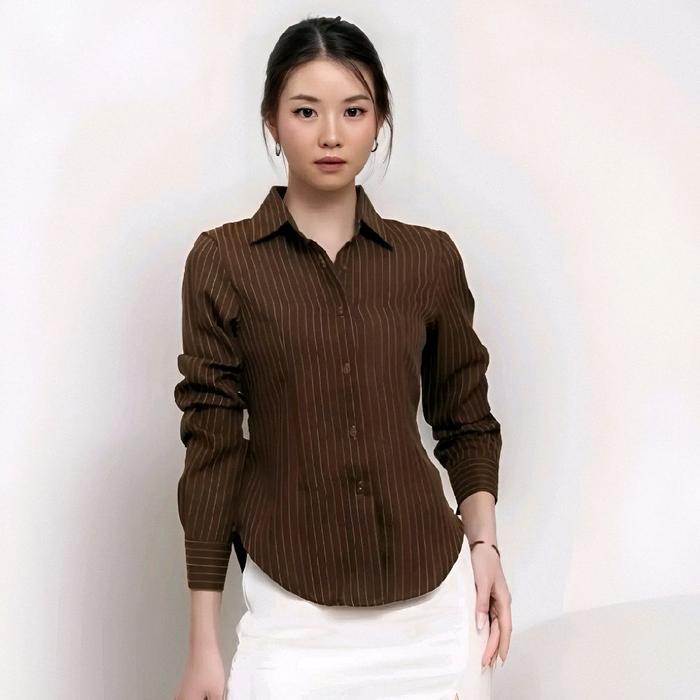 Kemeja Wanita Luna Stripe Fitted Shirt - Atasan Wanita Stripe Salur Kemeja Basic Casual Lengan Panjang - Kemeja Kantor F