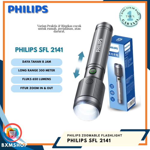 Philips Sfl2141 Senter Led Zoom Flashlight Adjustable Brightness 650 Lumens Electric Torch Original
