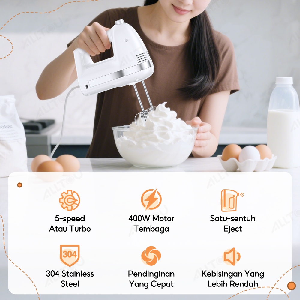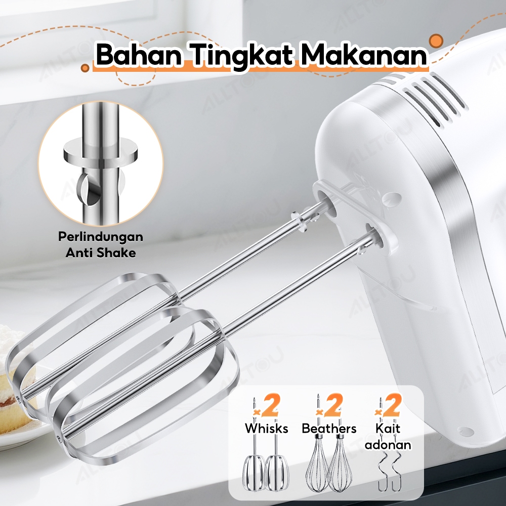 ALLTOU Hand Mixer Fungsi Turbo Pengaduk 5 Kecepatan / Hand Mixer Free 6 Buah Alat Pengocok Putih