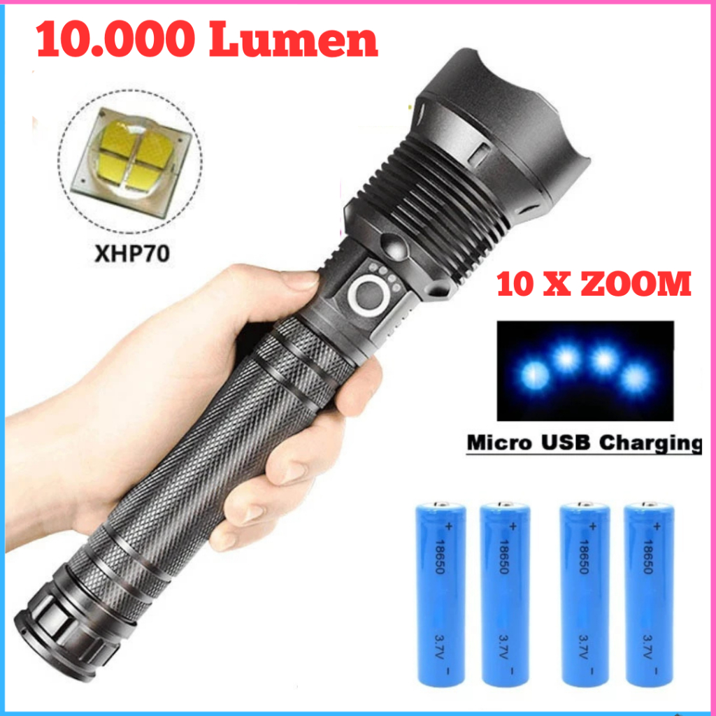 Terbaru 100 PERSEN Xhp70.2 Super Terang Senter Led Flashlight Usb Rechargeable 10.000 Lumens Bisa Zoom 10X 2 Pcs Baterai Charg