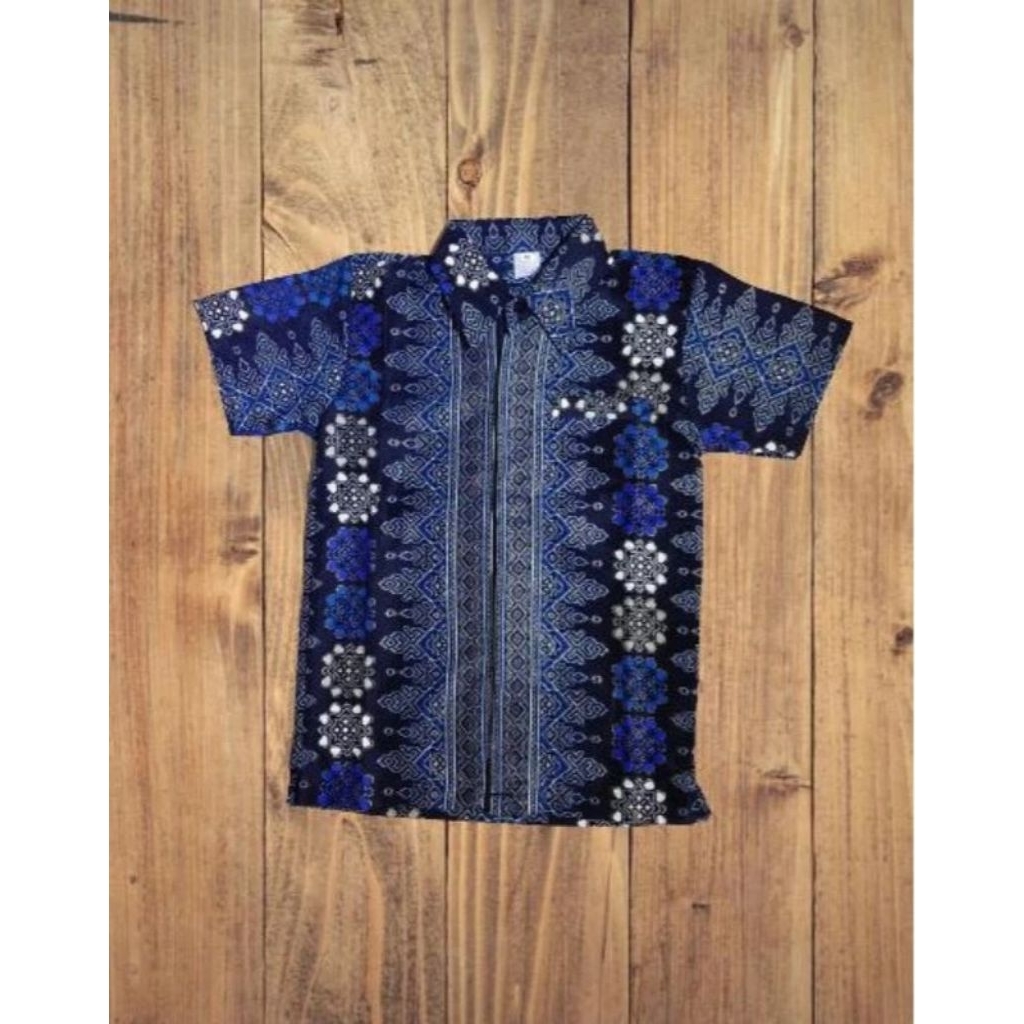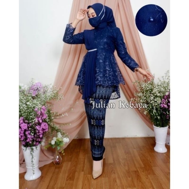 Setelan Pasangan Kebaya Brokat Busui Payet Modern Jumbo Dan Kemeja Batik Ayah Anak Motif Toraja Navy