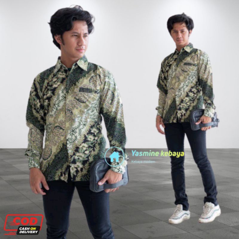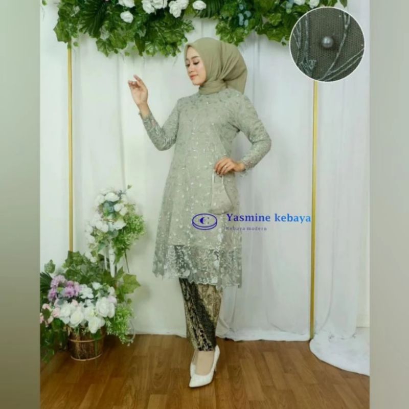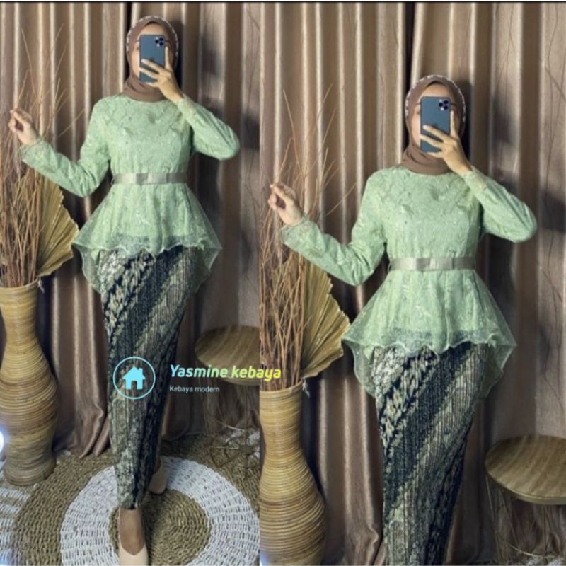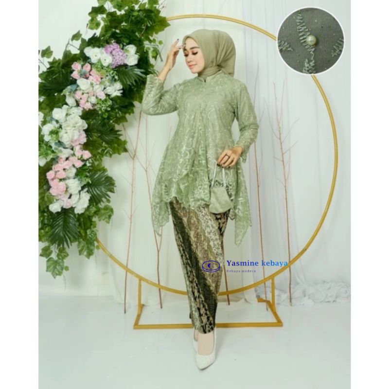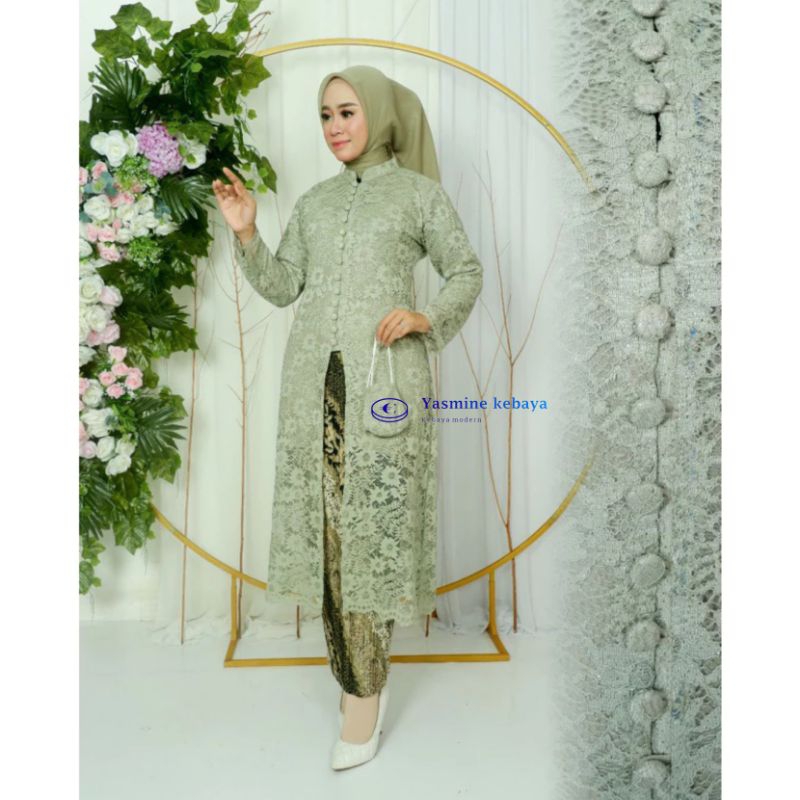 Setelan Baju Couple Kebaya Tunik Brukat Busui Set Kemeja Batik Pria Motif CM Sage / Couple Kebaya Ibu dan Anak Warna Sage Green / Setelan Couple Kebaya Sage Green Modern