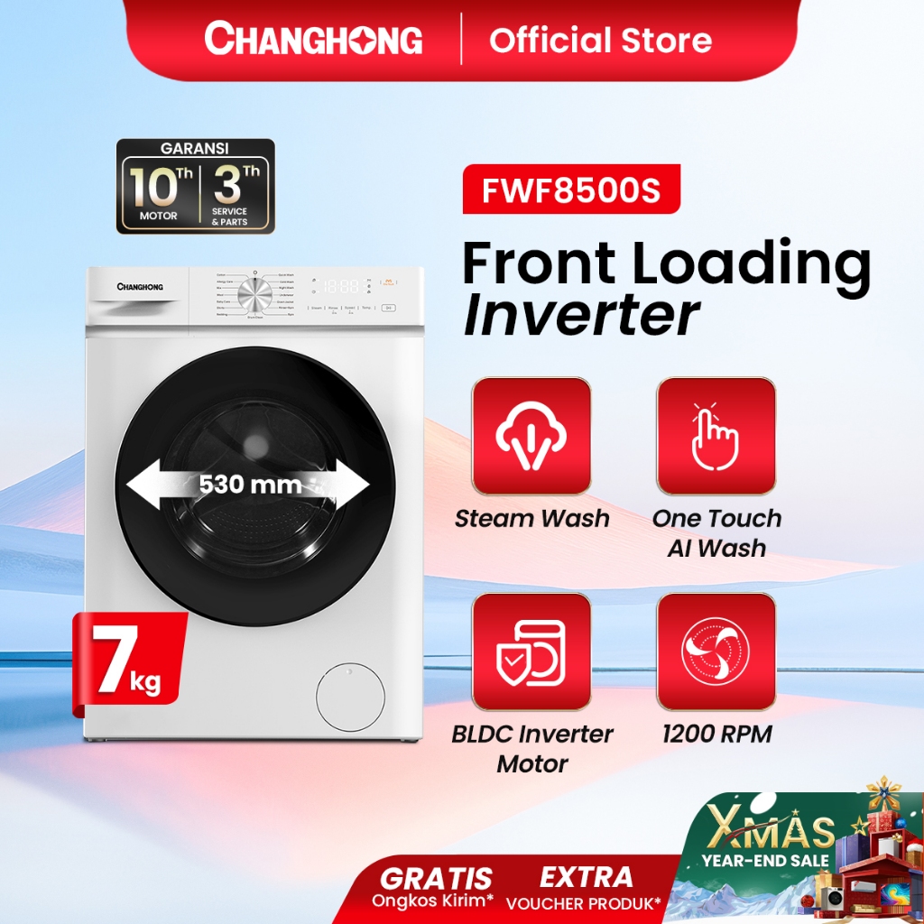 Changhong Mesin Cuci Smart Inverter Front Loading Kapasitas 7 kg Model FWF8500S Bukaan Depan
