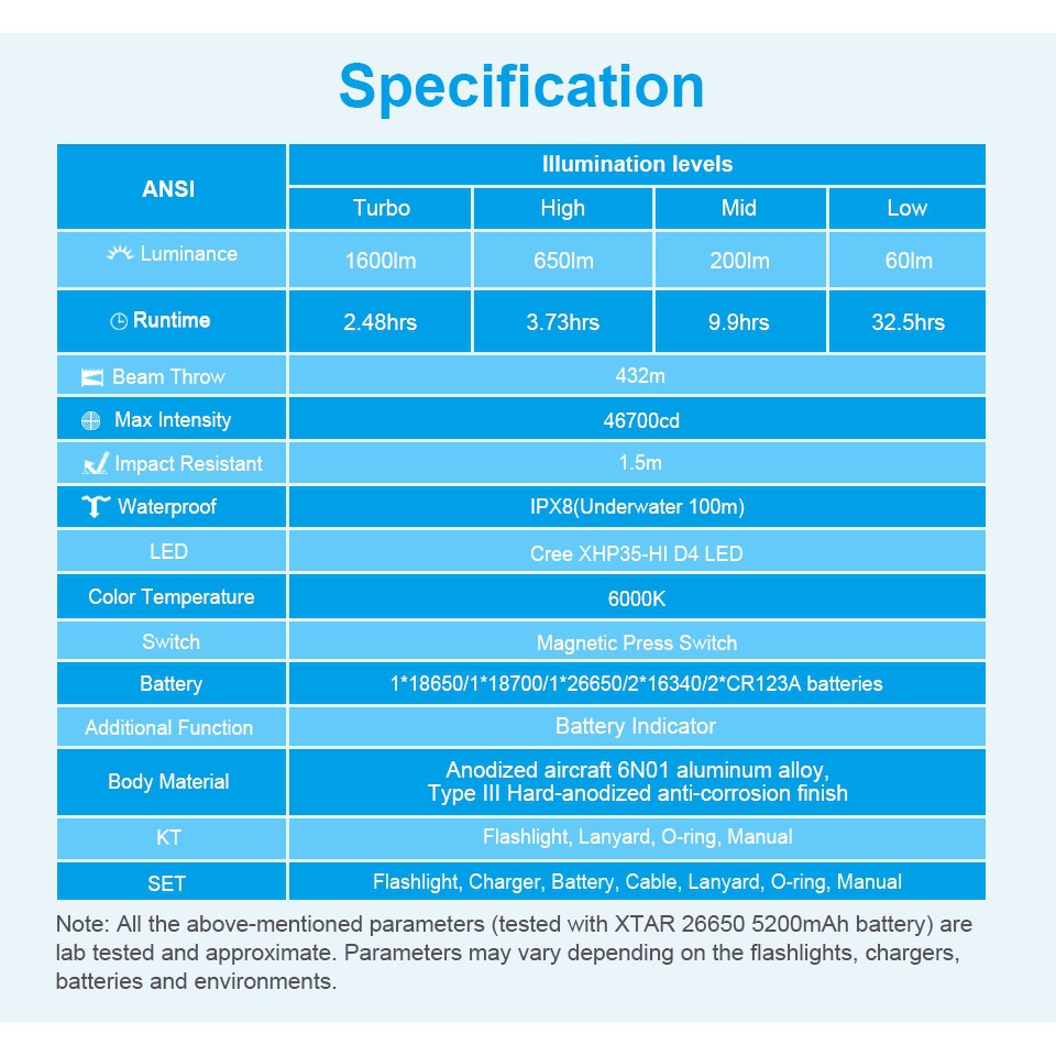 Xtar D26 1600S Senter Diving Cree Xhp35-Hi D4 Beam Distance 432M