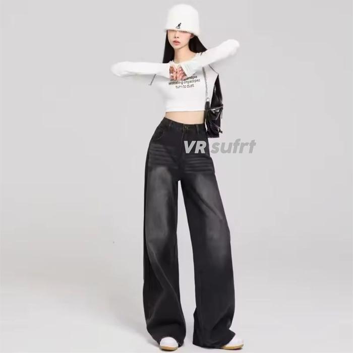 Unisex Baggy Jeans Wanita Celana Jeans Wanita - Celana Loose Jeans Wanita - Koreans Jeans Wanita - Hitam Retro Wisker, X